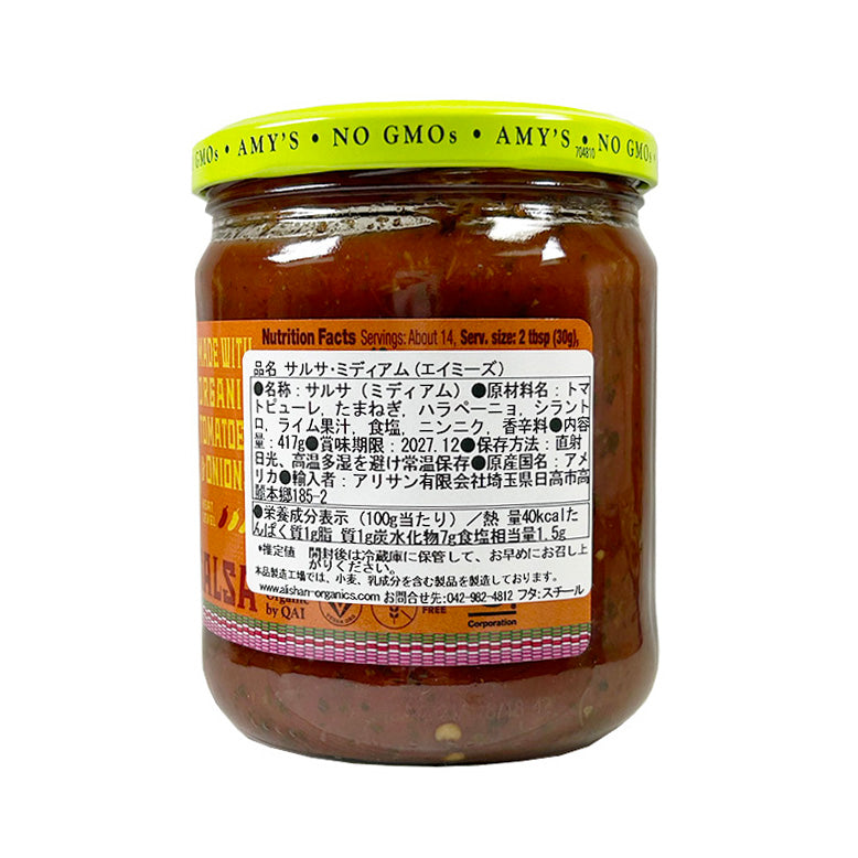 Salsa simply means “sauce.” Jarred salsa like Amy’s is a form of pica de gallo or salsa cruda, a mixture of chopped tomatoes, jalapeño chilies, cilantro, garlic and lime juice, but cooked a bit to increase their shelf life. Amy’s salsa is incredibly fresh tasting, made with sweet organic vine ripened tomatoes, organic vegetables and seasonings. Great for tacos, burritos, dipping tortilla chips, and other Mexican favorites.
