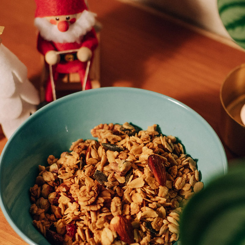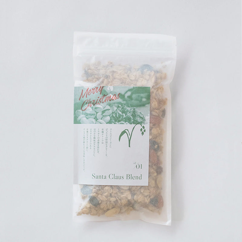 「冬の期間限定グラノーラ」クリスマスシーズンにぴったりの特別なグラノーラ。有機カランツはトナカイの赤鼻を思わせ、ほのかな酸味がアクセントに。まろやかなコクのある有機ピスタチオと一緒に、サンタも頬が緩むような美味しさをどうぞ。