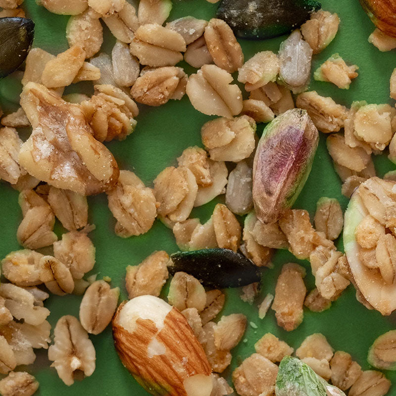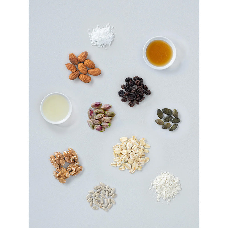 有機オーツ麦(アメリカ産), 有機メープルシロップ, 米油(国内製造), 有機ピスタチオ, 有機玄米粉, 有機アーモンド, 有機くるみ, 有機カランツ, 有機かぼちゃの種, 有機ひまわりの種, 塩(海水(宮古島)), (一部にくるみ、アーモンドを含む)