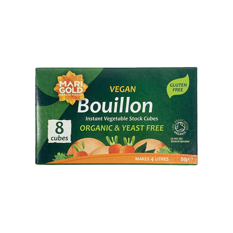 1パックに8個入り(10.5g x 8 個) オーガニック、ヴィーガン、酵母エキスフリーのブイヨンキューブ。1個のキューブを500mlのお湯に溶かしてご使用ください。スープ以外にも野菜炒め、ホワイトソース、チャーハン等、幅広くお料理の味付けにご使用いただけます。夏期は冷蔵扱い。