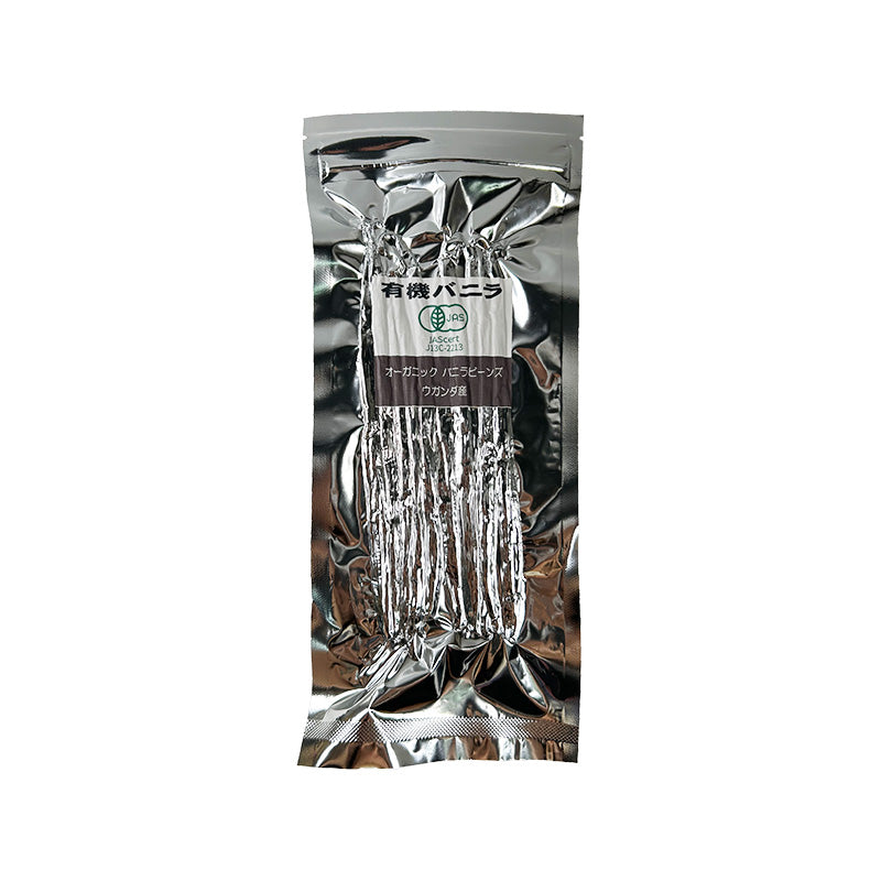 品種は、プラ二フォリア種(Planifolia)です。ウガンダ産のバニラビーンズは、他の産地のものに比べてバニリン(バニラの芳香成分)含有量が高いのが特徴です。利用方法: バニラビーンズの鞘を縦にナイフで切り裂き、ナイフの背で中の小さな黒い種をしごき出して使います。さやとタネを牛乳などに加わえ、加熱して香りを移して使用します。*表面に白い斑点や透明や白色の結晶が出ることがあります。これはバニラビーンズの油分が低温で凝固したり、香りの主成分であるバニリンが結晶となったものですので、品質に問題はありません。*製造工程において毛布に包んで発酵と天日乾燥を繰り返します。入念な検品をしていますが、稀に毛布の小さな繊維がついていることがあります。取り除いてお使いください。