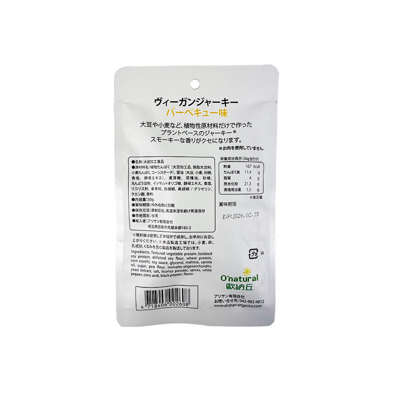 大豆や小麦タンパクなど、植物性原材料だけで作ったプラントベース のジャーキー。スモーキーな炭火焼の風味に仕上げてあります。