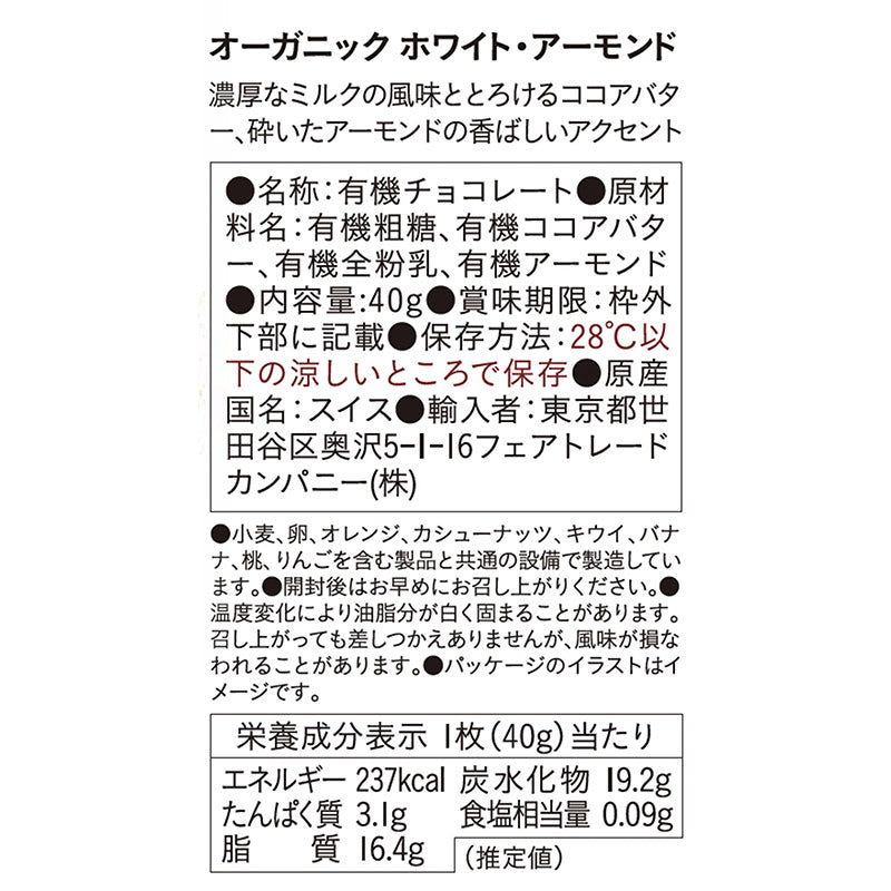 濃厚なスイス産ミルクとココアバターを使ったホワイトチョコに砕いた有機アーモンドのコクが加わり奥深い味わい。